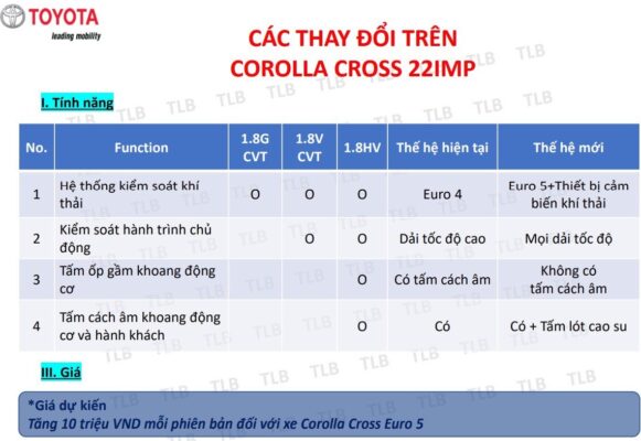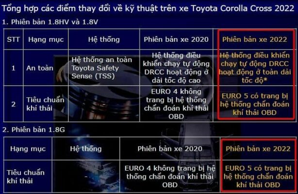Phiên bản Model 2022 Toyota Cross đang phân phối tại Toyota Hải Dương có những thay đổi như sau: Hệ thống kiểm soát khí thải từ Euro 4 lên Euro 5 thêm thiết bị cảm biến khí thải. Hệ thống kiểm soát hành trình cải tiến ở mọi dải tốc độ. Phiên bản mới tấm ốp gầm khoang động cơ không còn trang bị do không phù hợp tại thị trường Việt Nam. Ngoài ra xe được trang bị tấm cách âm khoang động cơ và hành khách. Tổng hợp các điểm thay đổi về kỹ thuật trên từng phiên bản của xe Toyota Cross 2022