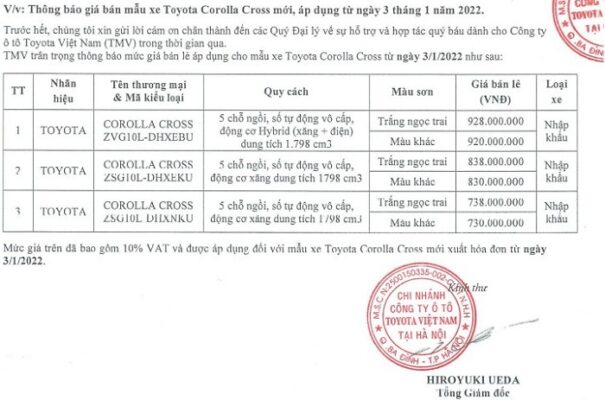 – Toyota Corolla Cross bản xăng điện, 5 chỗ ngồi, số tự động vô cấp, động cơ Hybrid, dung tích 1.798 cm3 nhập khẩu nguyên chiếc giá bán lẻ là: 920.000.000 VNĐ, màu trắng ngọc trai là: 928.000.000 VNĐ